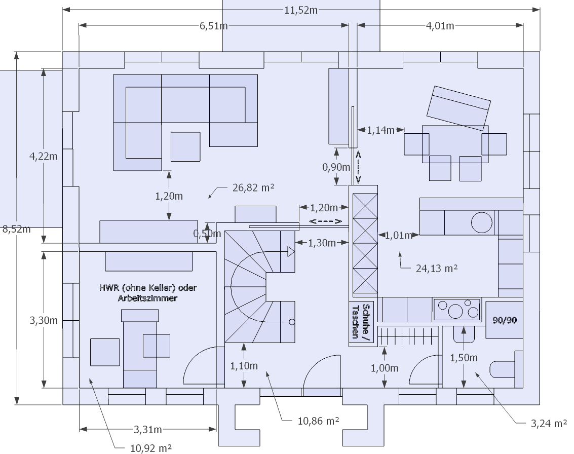 erdgeschoss_variante6.png - [Bild vergrößern] 3x bearbeitet Verfasst am: 31.03.2014, 16:47 zitieren Jo, das Arbeitszimmer käme dann nach oben. Siehe hier: ![]() Genau so ist das. Hauswirtschaftsraum, Vorrat und Heizung sind dann ein Raum. Nicht ideal, aber haben wir in der aktuellen Wohnung auch nicht wirklich anders. Der Keller steht nur wg. dem Geld zur Diskussion. 60.000,- EUR zahlen wir leider nicht aus der Portokasse. Verfasst am: 31.03.2014, 16:51 zitieren Ich wollte nur 1,2 m. Ihr habt mit mehr angefangen ![]() Aber stimmt schon. Auf 1,5 m sollte ich schon reduzieren. Verfasst am: 31.03.2014, 16:58 zitieren Du stellst wohl keinen Weihnachtsbaum auf oder.. zumindest wäre der dann beim Fernsehen hinderlich ![]() Verfasst am: 31.03.2014, 17:13 zitieren Selbst 1,2 m sind eigentlich zu wenig. 10 cm pro Wand, 30 cm für ein kleines Regal. Bleiben gerade noch 70 cm als Durchgang. Unabhängig davon müsste man sich auch fragen, ob das Wohnzimmer nicht langsam zu klein wird. Ich würde das wenn nur machen, wenn kein Keller umgesetzt wird und wirklich Platzmangel absehbar ist. Nur wenn ich in der Küche 12 Elemente habe, wo ich jetzt nur 8 habe (davon 2 große Vorratsschränke), sehe ich da eigentlich keinen Bedarf. Aber vielleicht lohnt sich ja der Versuch die Küche mit dem Essbereich zu tauschen und dann nur einen halben Vorratsraum zu realisieren. Das können wir flexibel entscheiden. Ich dachte nur wenn die hinten symmetrisch sind, dann sieht das besser aus. |